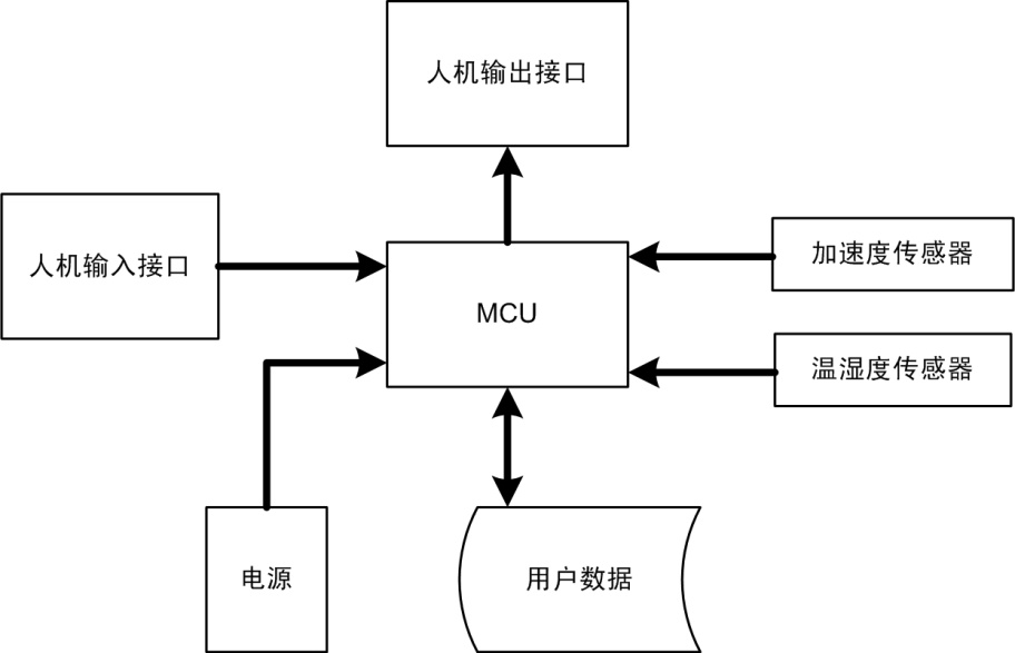 硬件上选用了功耗极低,处理数据能力较强的MKL46Z128VLH4微控制器作为主控芯片。计步传感器采用了分辨率高、反应速度快、功耗低的MMA8652FC三轴加速度传感器。考虑到温度和湿度对科学的运动有较大的关系,我们采用温湿度传感DHT11采集数据并显示在屏幕上。电源是计步器能够正常稳定工作的前提,应采用小巧,更换方便和续航能力强的电源,所以本设计采用了CR2032作为电源。用户数据要能稳定的存储在计步器中。计步器要有人性化的输入输出接口。总体设计框图如图所示。