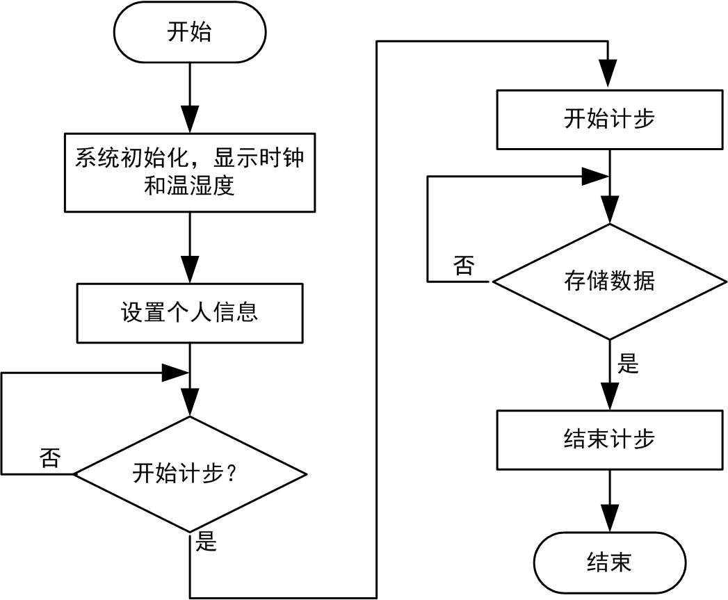 本次设计主要有5个功能,即计步算法的实现,Flash存储运动数据,温湿度传感器的实现,按键的实现,及人机界面的设计。首先上电之后,主界面显示当前时间和温湿度。之后设置个人参数,输入性别、步长、体重。随后切换界面,进入计步状态,加速度计正常工作,实时显示当前步数、距离和消耗的热量。计步完成后,可以将信息存储起来,下次上电之后可以调出该信息,计步器可记录三天的运动信息。在没有按键按下一段时间内系统关屏以降低功耗,在加速度计不工作时且没有其他操作,系统经过一段时间自动进入低功耗模式。本项目软件部分采用模块化设计的思想,把系统分为七个模块,然后每个模块对外留出接口,方便其他模块与其通信,每个模块之间无不干扰,相对独立。