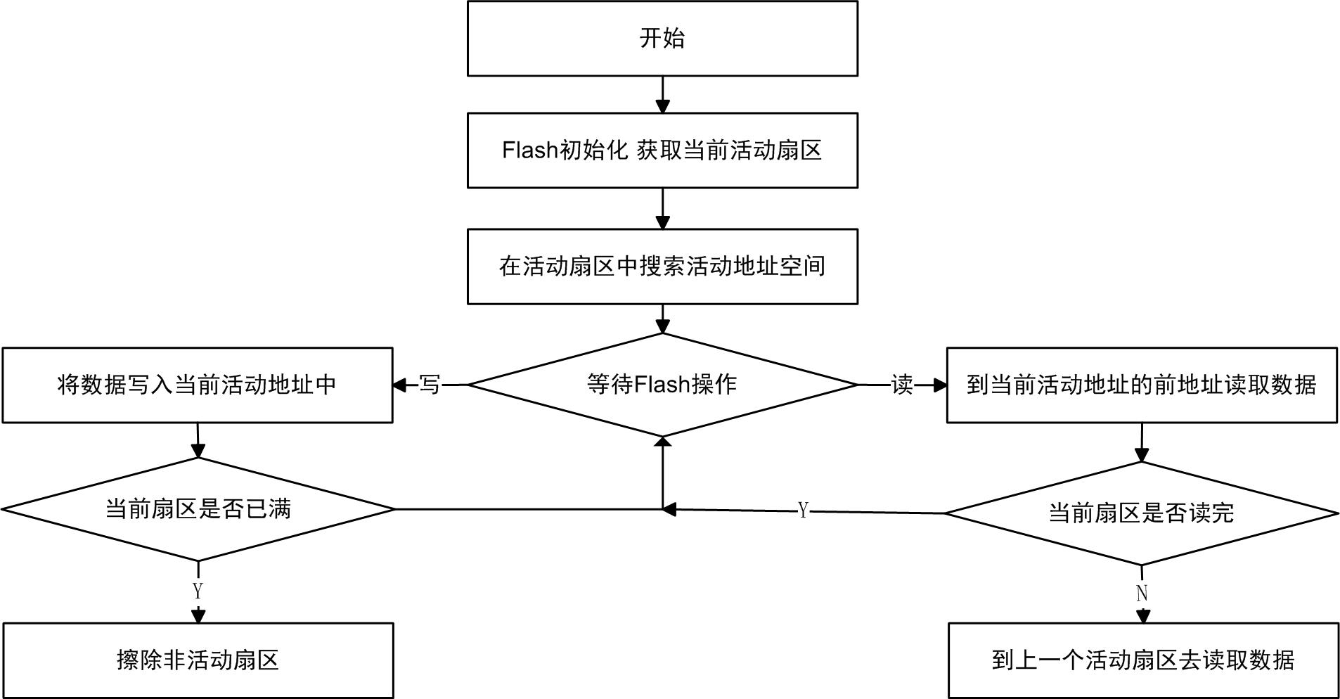 Flash管理的程序流程图如图所示。首先进行Flash初始化,读取Flash中3个扇区的首地址下的4个字节数据,得到当前Flash存储空间的活动扇区。之后,在当前活动扇区中查找当前活动地址,保存索引。整个初始化过程是Flash管理最重要的部分。完成后循环更新Flash管理信息,实现动态的地址分配。
