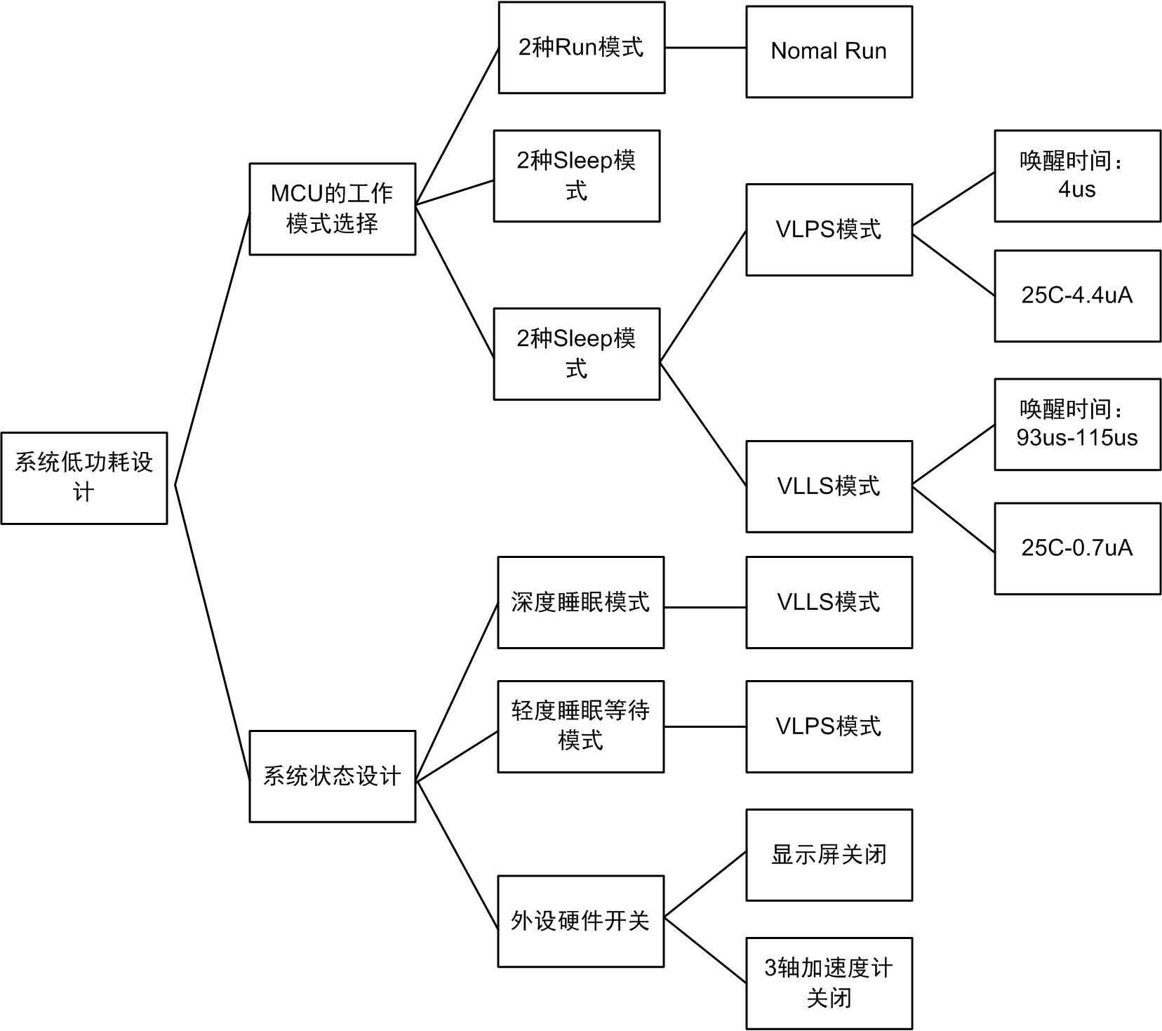 KL46Z系列微控制器共有十种工作模式,分别是两种Run模式,两种Sleep模式,六种Deep Sleep模式。在这八种睡眠模式中,各自的功耗不同,唤醒条件,唤醒所需时间,均不相同,工作电流在174nA至7mA不等。用户可根据实际需求配置和切换微控制器的工作模式。本系统选择了功耗较低的Deep Sleep中唤醒方式最灵活的VLPS(Very Low Power Stop)模式,作为低功耗的实现模式。如图所示。