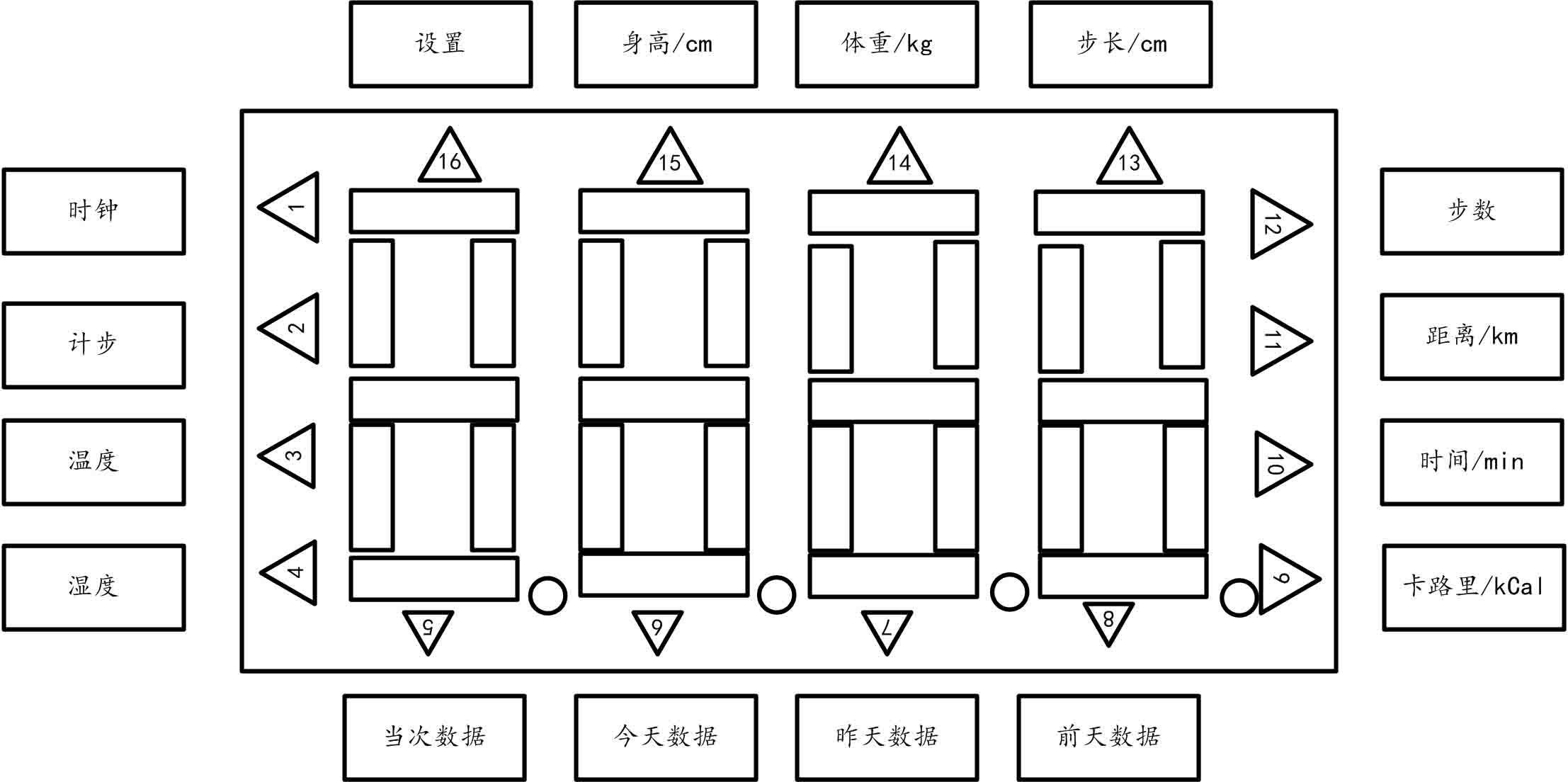 为了提供友好的界面显示,方便人机交互,我们采用的段式LCD除了提供基本的数字字符,还提供了箭头标示,结合标签,让用户在使用的过程中得到更多的信息。本设计的主屏幕箭头的功能标示如图所示。