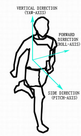 在可用于分析跑步和步行的特征当中,我们选择“加速度”作为相关参数。跑步个体(及其相关轴)的运动包括三个分量,分别是前向(“滚动”)、竖向(“偏航”)和侧向(“俯仰”),如图所示。
