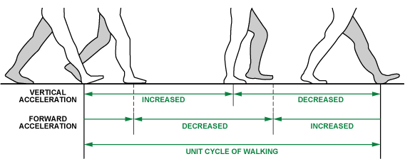 步行时人的步伐分解如图所示。无论如何穿戴计步器和做何种运动(跑步,散步,快走等),总有至少一个轴具有相对较大的周期性加速度变化,因此可以通过阈值检测和针对所有三个轴上的加速度的动态阈值决策算法来检测单位步行或跑步周期。