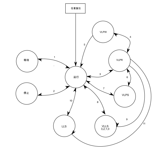 本设计采用基于Cortex-M0+内核的微控制器MKL46Z128VLH4具有多个灵活的低功率模式,I2C、ADC、DAC、LP定时器和DMA等功能支持低功耗模式运行,无需唤醒内核。所选用的三轴数字加速度传感器在低功耗模式是电流为7μA,正常工作电流在30μA左右。另外,所选用的段式LCD功耗极低,正常工作电流在μA级别。总体而言,本设计可以实现整机电流在1~2mA的低功耗计步器。如图所示为低功耗模式转换示意图,我们在待机状态下选择VLPS这种深度睡眠模式,可以获得极低功耗。